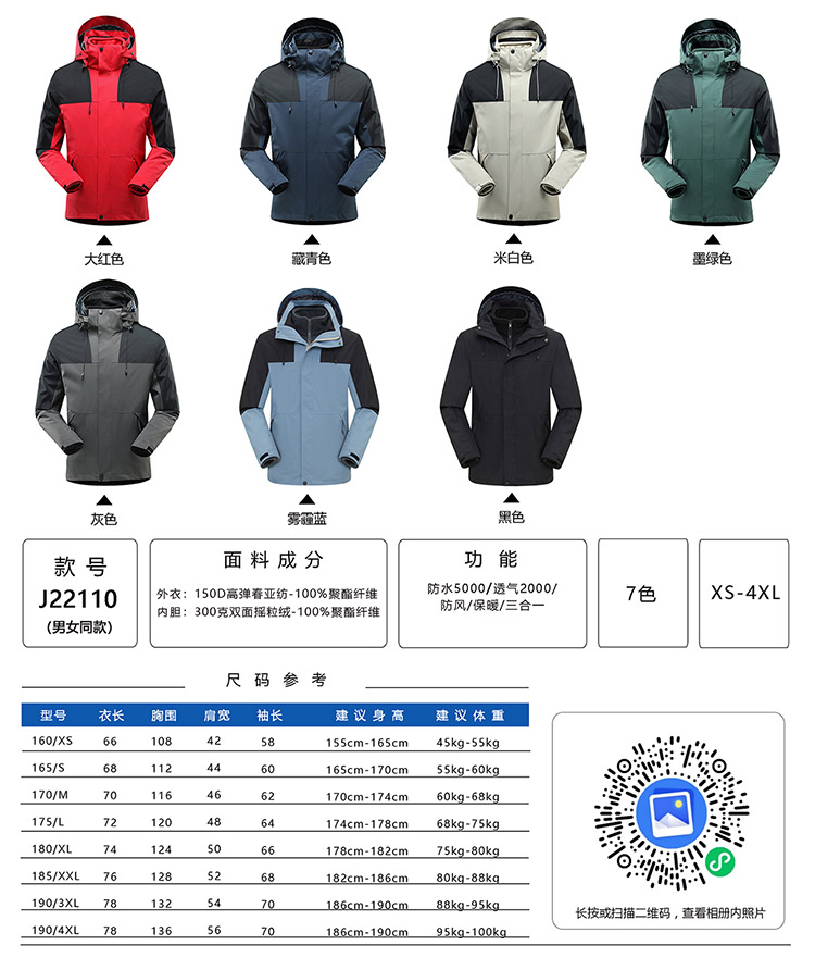 • 外衣:150D高彈春亞紡-100%聚酯纖維內膽:300克雙面搖粒絨-100%聚酯纖維防水5000/透氣2000/防風/保暖/三合一男女同款沖鋒衣登山服,奧特萊斯定制款防寒保暖情侶套裝沖鋒衣。